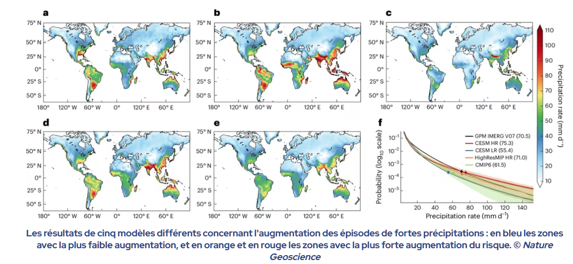Ce chiffre de 41 % est une moyenne sur la Planète, mais il y aura forcément de grandes différences à l'échelle des continents, des pays, et des régions. Tous les modèles utilisés pour les simulations ne sont pas d'accord sur la répartition exacte des zones où les fortes pluies vont le plus augmenter, mais les différents résultats permettent de dégager une grande tendance :