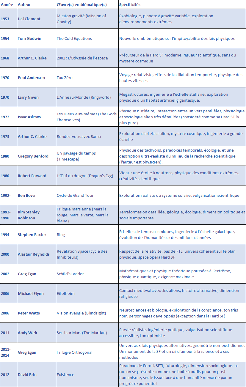 Le tableau suivant présente 19 œuvres marquantes de Hard SF (1953-2012).