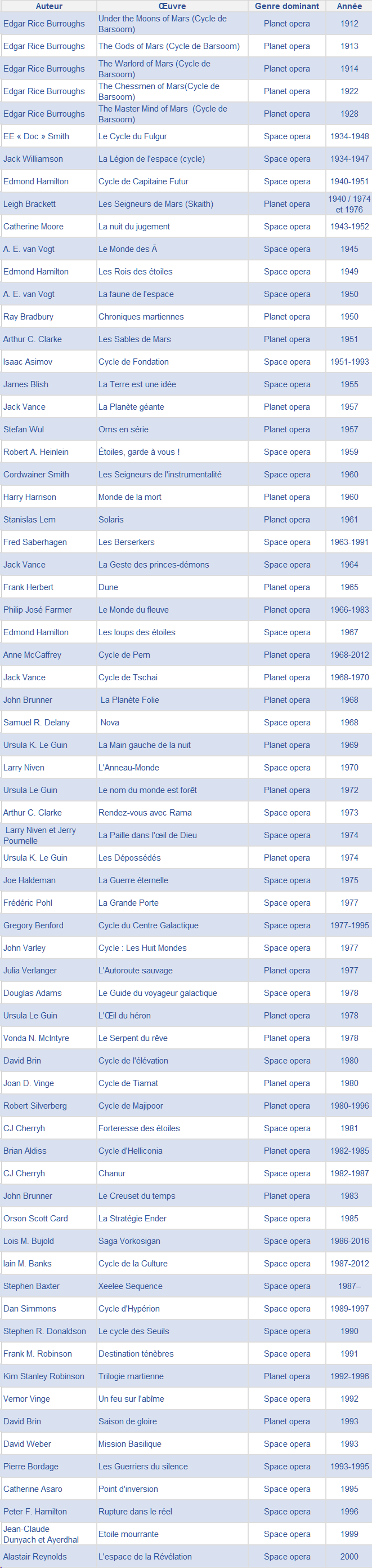 Le tableau suivant présente 69 œuvres marquantes de Planet & Space Opera du XXe siècle (1912-2000).